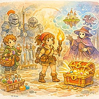 Puis Fille voit un coffre caché sous le sable. Le coffre est petit. Il est ancien. Une perle est posée dessus.